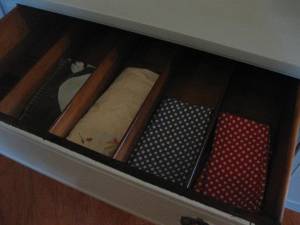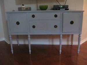 And … here is the painted table. The color is just what I imagined. My handiwork is not perfect–I find that painting furniture is much harder to do well than it seems. The cable box is also a bit of an eyesore, but so essential! I am really pleased to have such a tidy place to stow my napkins. Wouldn’t it be nice to have an array of polka dotted napkins in each little cubby?