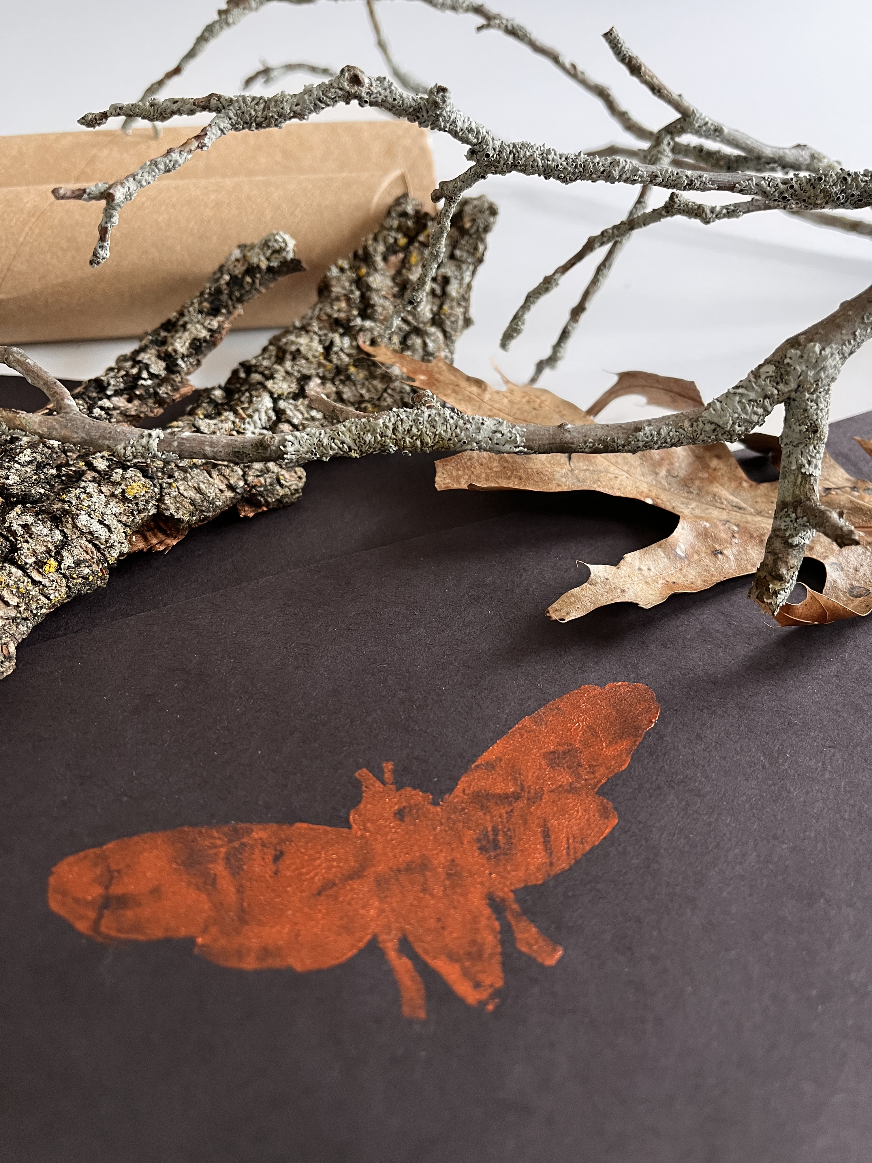 Then comes the fun part. I used a paintbrush to layer the foam shapes with paint. (You could opt for filling a shallow container with thinner paint for kids to dip and coat their stamps.) I loved experimenting with paint thickness and different colors to see what emerged. Copper-colored acrylic paint looked great on black paper. Let me know if you give this craft a try!