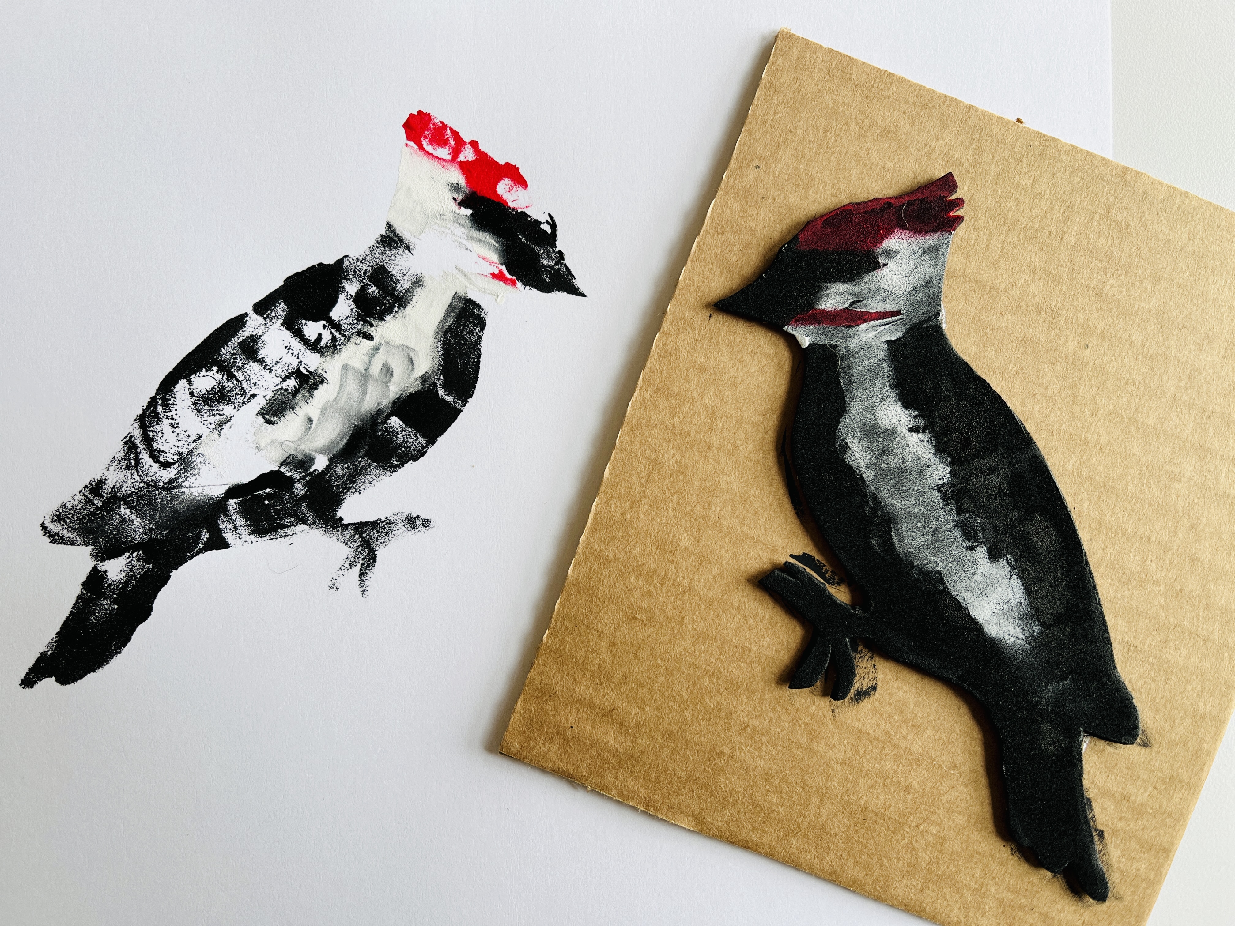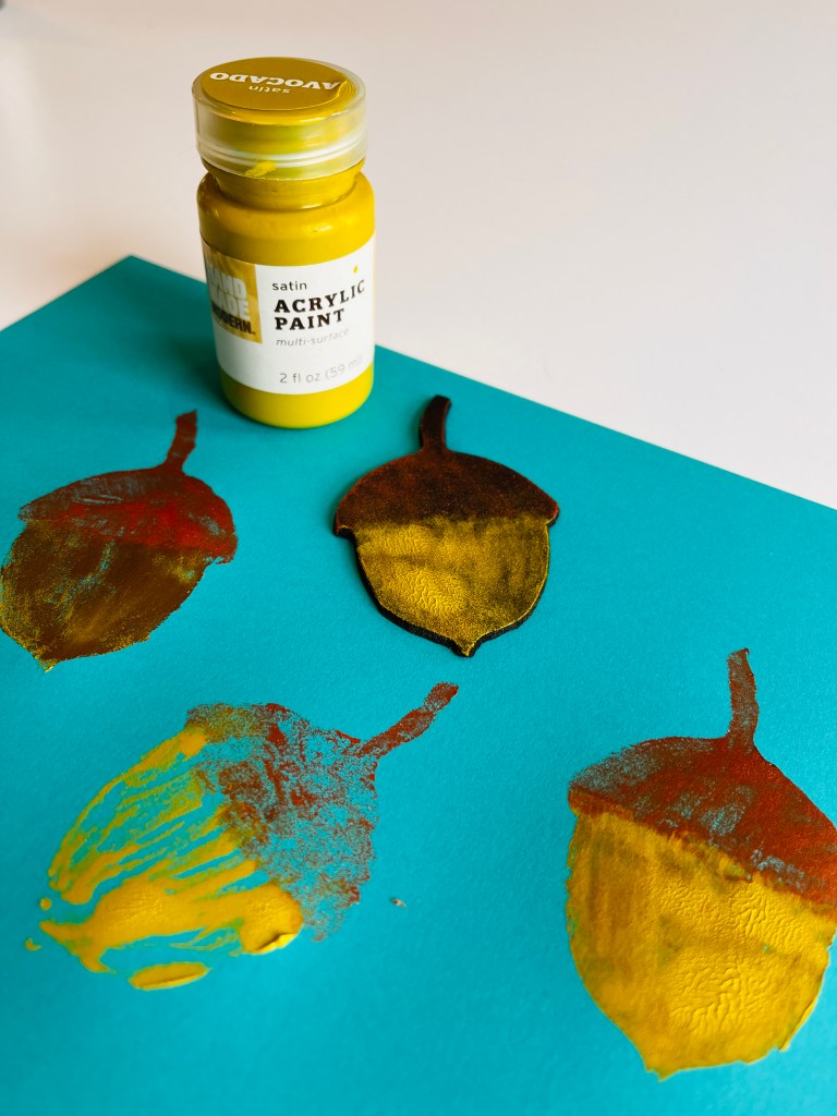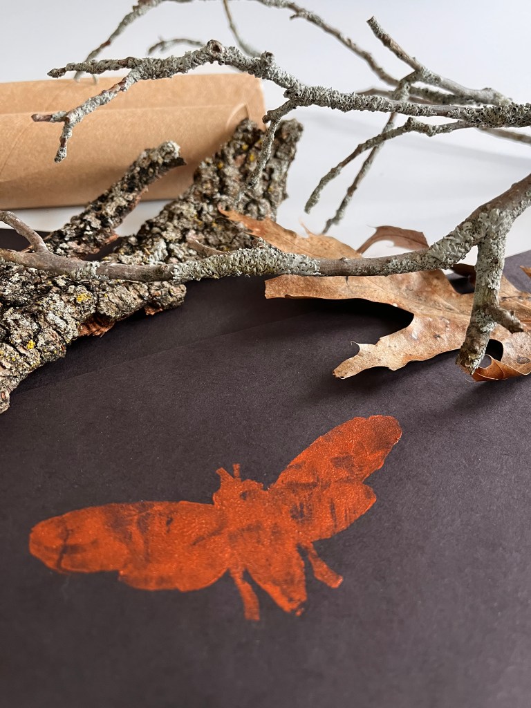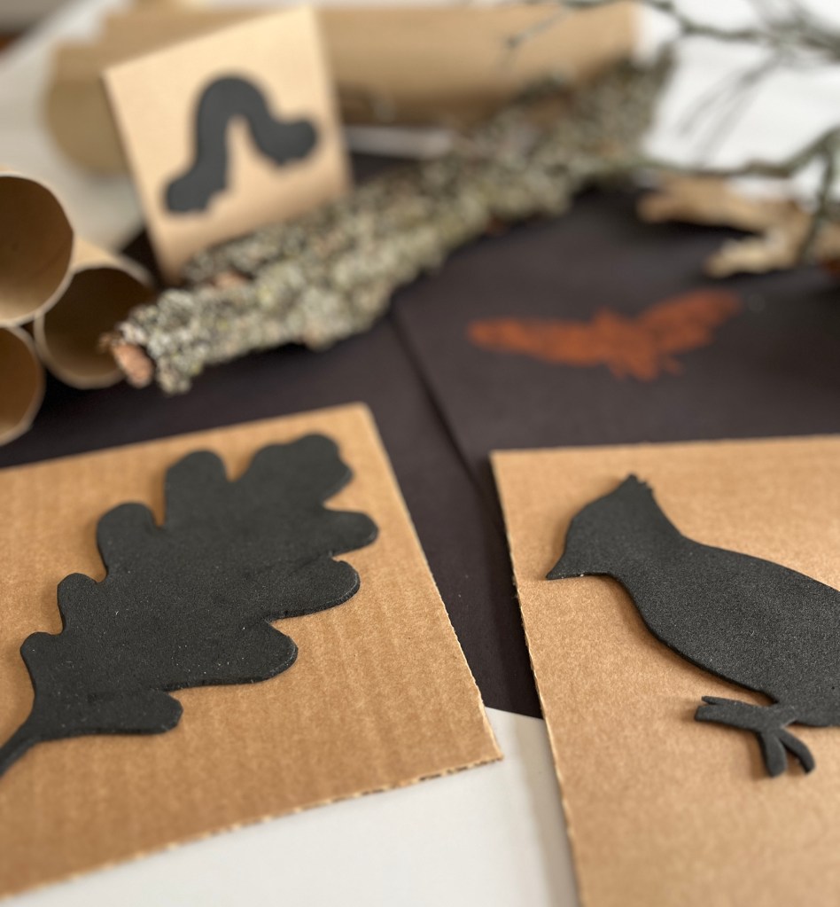 To begin, I looked online for some outlines of creatures that I like. I chose an oak leaf, acorn, inch worm, cicada, woodpecker, and a chickadee. I printed out the images and used a glue stick to adhere them to a piece of craft foam. The glue stick does a good job of keeping the paper in place while you cut along the outline and through the foam. Yet, it didn’t stick so well that I couldn’t easily peel off the paper, leaving the foam shape intact.