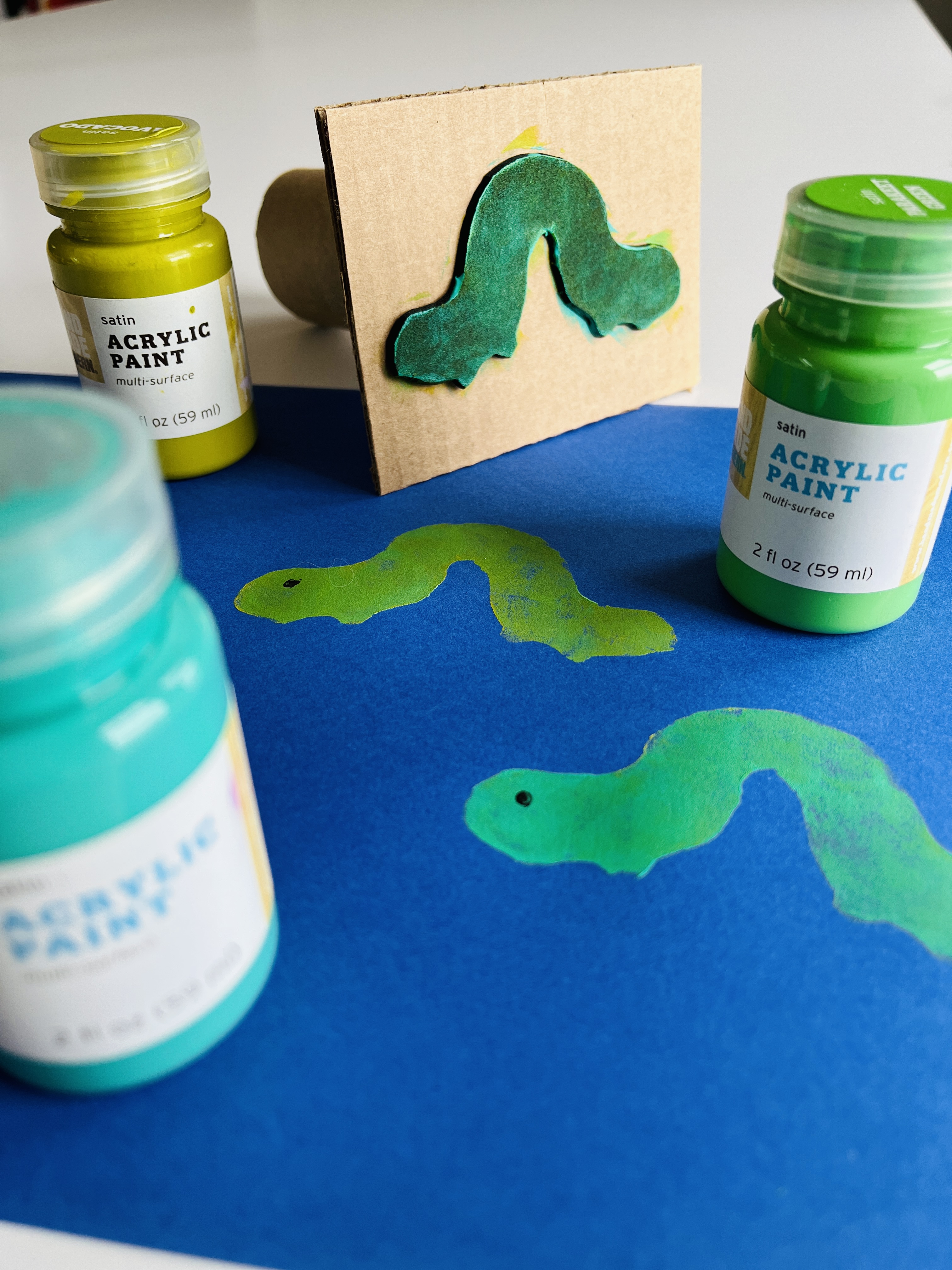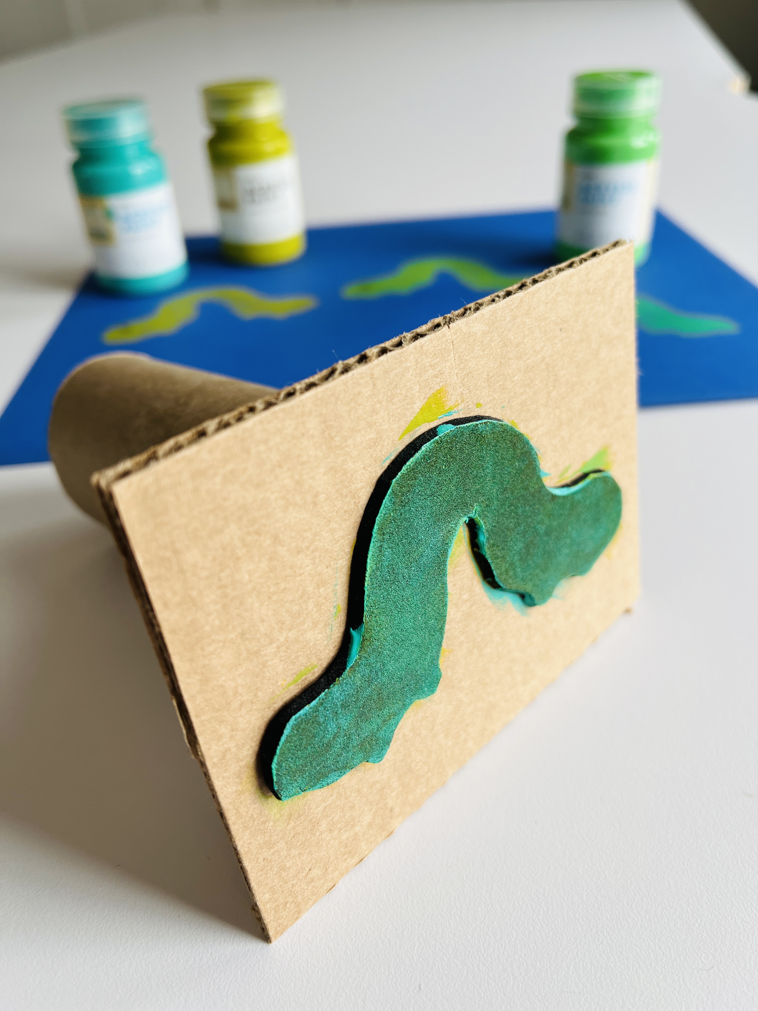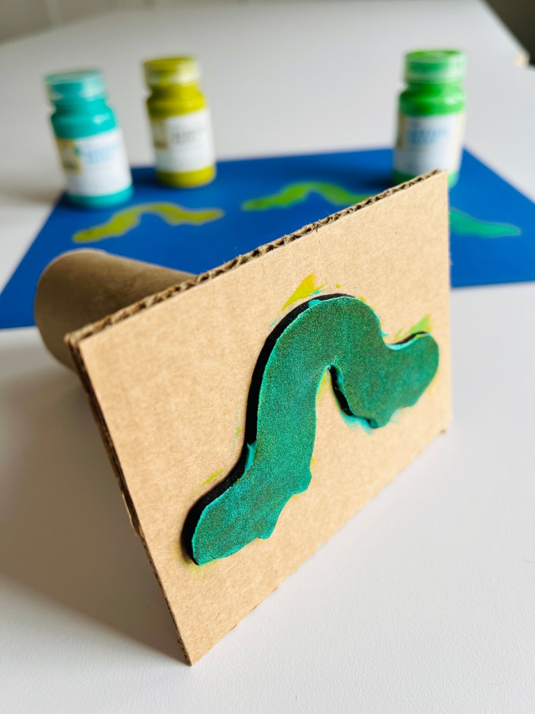 Next, I glued the foam shape to flat cardboard. To make a stamp handle that would suit little hands, I hot-glued toilet paper rolls to the back of the flat cardboard.