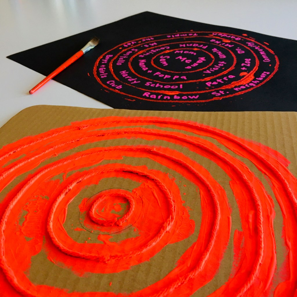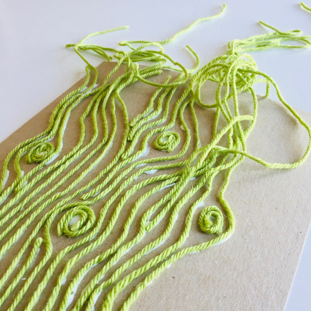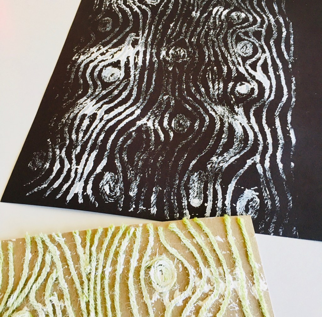 * Teens and grown-ups who don’t want to be left out of the fun but want more of a challenge: try creating a block print of wood grain. My attempt is pictured above and below. I free-handed the design, starting with interspersed spirals (knots of wood) and then adding lines of yarn (wood grain) around them.