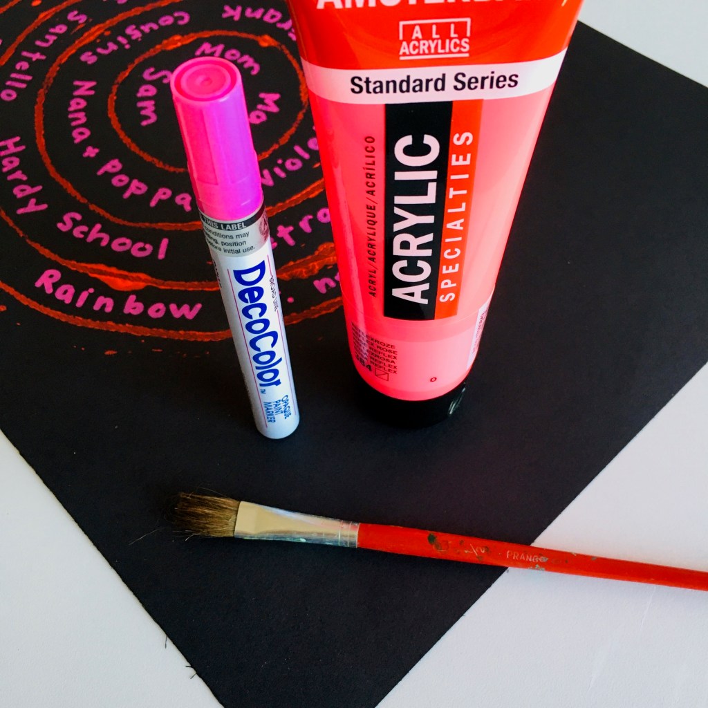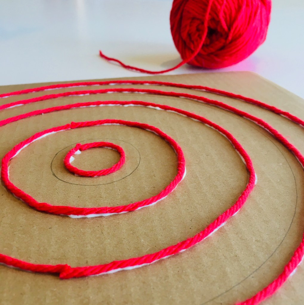 Trace or draw concentric circles on cardboard. We had fun running around the house gathering cups, bowls and other round objects to trace. Your circles can be lopsided–the rings of a tree certainly are!
