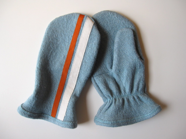I am so excited to have discovered the lovely online magazine petite purls (thanks to the oliver + s blog). It is a treasure trove of free knitting patterns for kids with a few sewing patterns. Meg, I thought these mittens would be a great use for your upcycled sweaters. I made some felt mittens for Betty using a similar pattern that I painstakingly resized for her little hands from a pattern for adult fleece mittens. This pattern looks much easier! I might add a soft cotton lining if I made these in wool–just tuck the lining inside the mittens and bind the tops together. I love the ’70s style racing stripes.