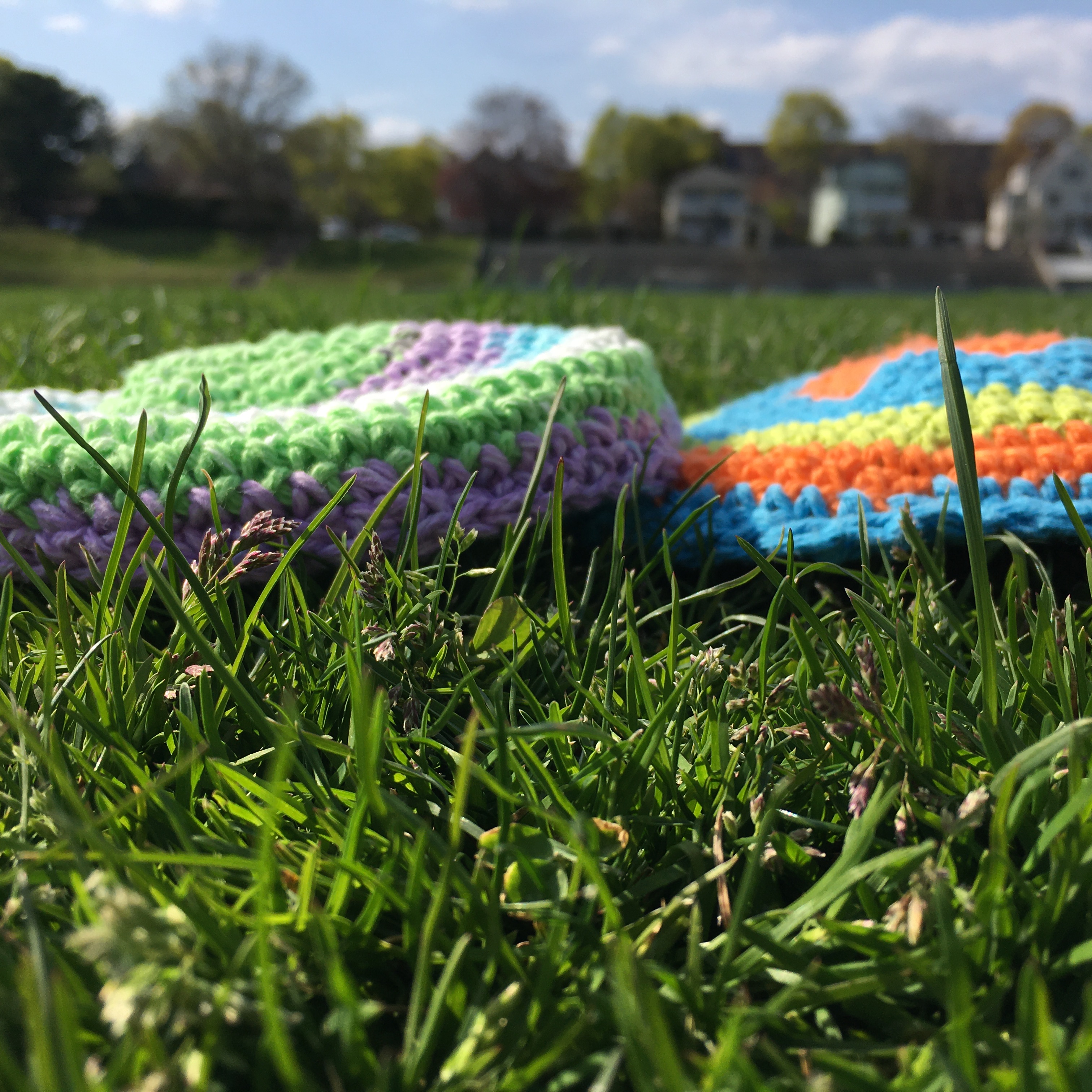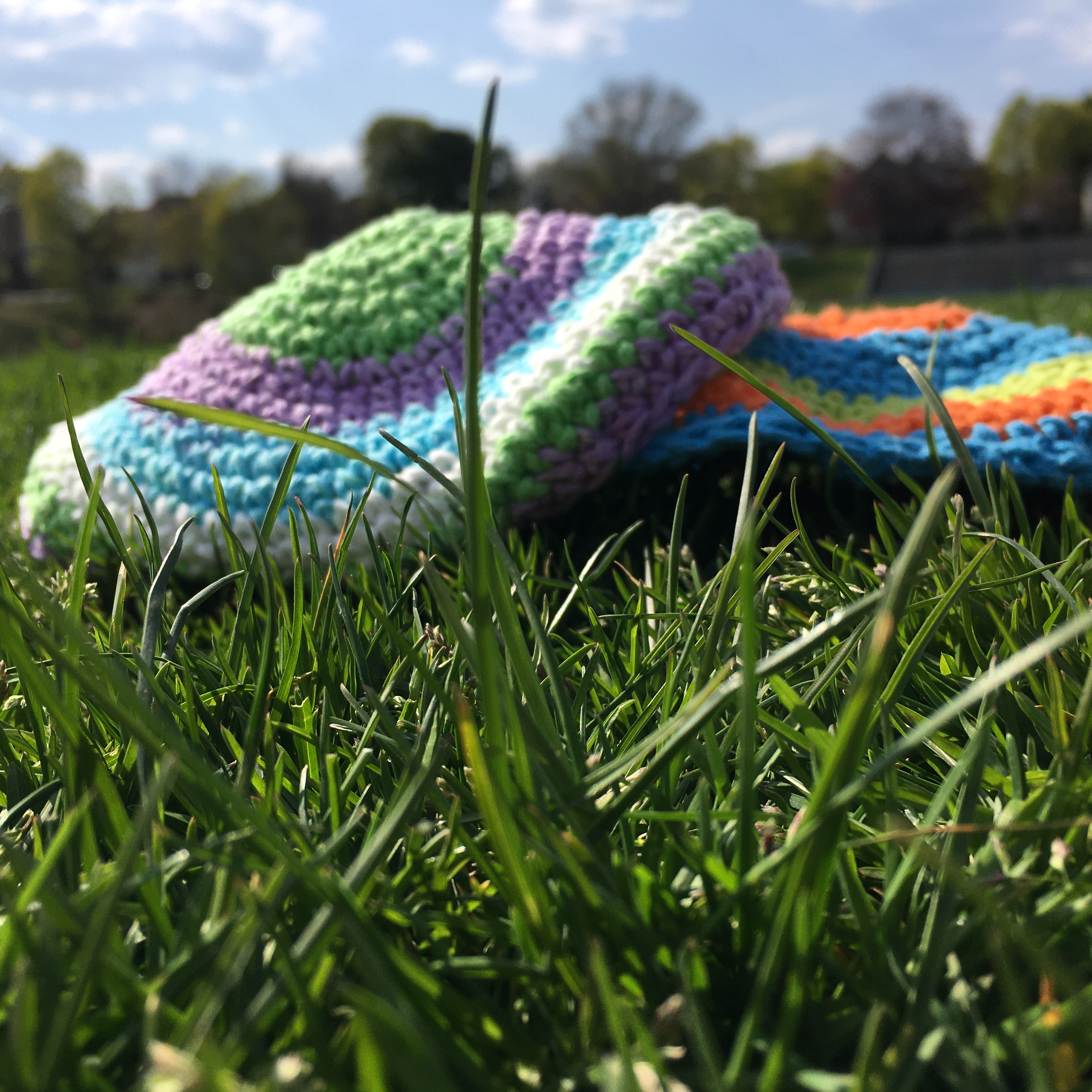 My friend Janet is a crochet wonder! She made these foldable, flyable, crocheted Frisbees for me to celebrate the publication of my book FLIP! How the Frisbee Took Flight (out *this* week)! You can tuck one in your pocket and take it to the park or fling it around your house–it won’t dent your walls or a human person.