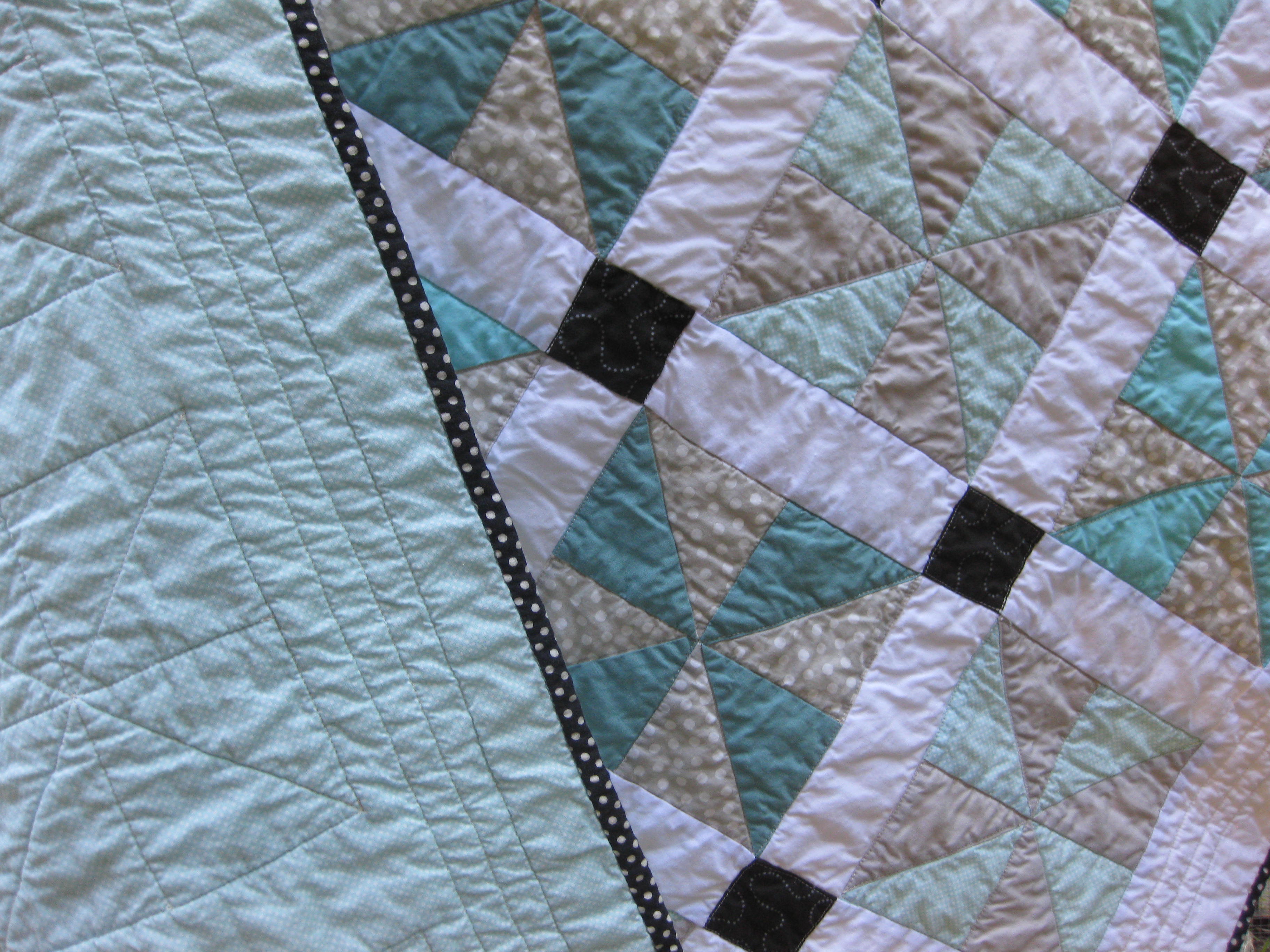 Just in time for the shower! This quilt turned out better than I thought it would. I quilted in the ditch around the pinwheels, rather than in my usual linear pattern, and I like the lofty finish. Seems very cozy for a baby.