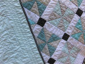 Because I have passed on attending my daughter’s school auction four years in a row, I donated a handmade baby quilt made-to-order, to assuage my guilt. It has been really interesting making something to another person’s taste. Teal, gray, and black? Really? I tried for some red, some orange, some yellow, but the quilt recipient knows what she wants. So, here is a bad picture of the quilt top, before sewing it up. It’s much more traditional than something I would usually make, but have to say I’m pretty pleased. It looks so quilty!
