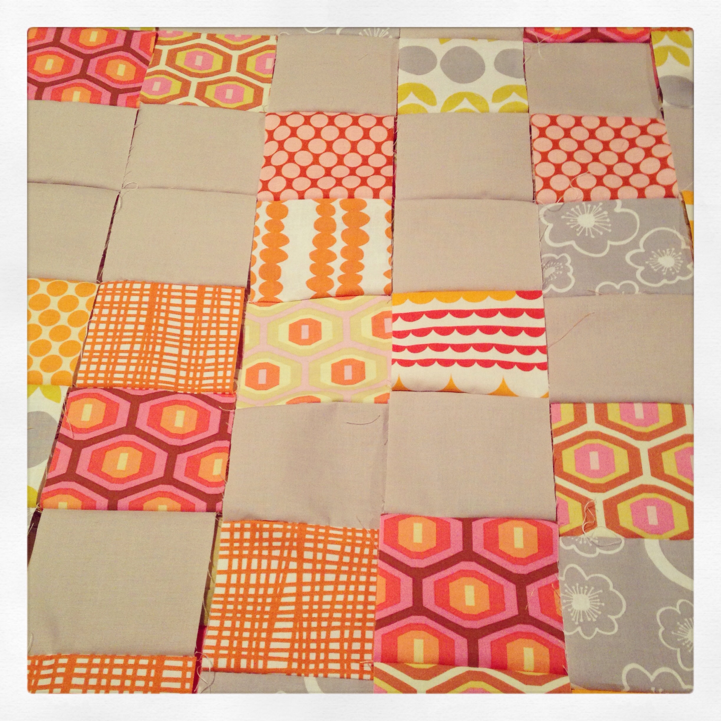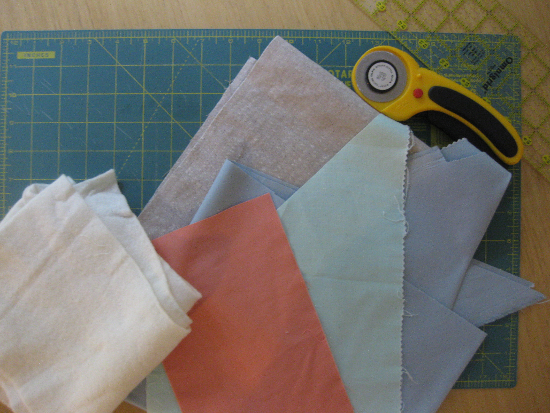 Three 5″ squares of solid quilting cotton. (I used three colors of Robert Kaufman Kona cotton: Salmon, Aqua, and Fog.)
