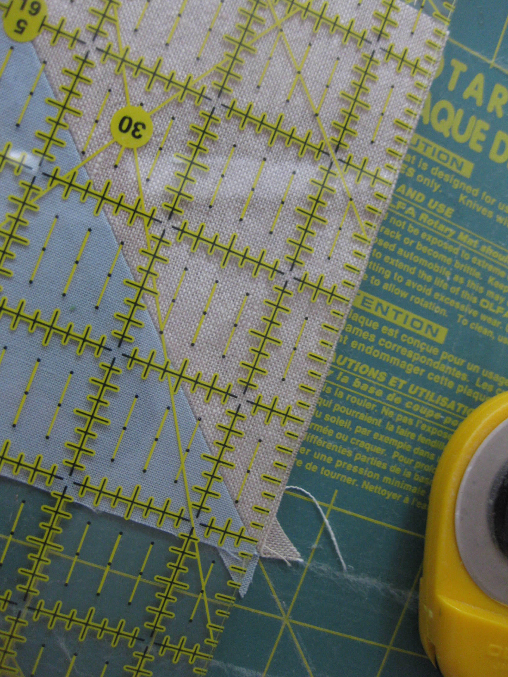 3. Trim your finished fronts so they are exactly 4.5 ” squares. (If your squares are perfect, give yourself a pat on the back and just trim away those little points.) Be sure to trim so your diagonal line stays neatly centered.