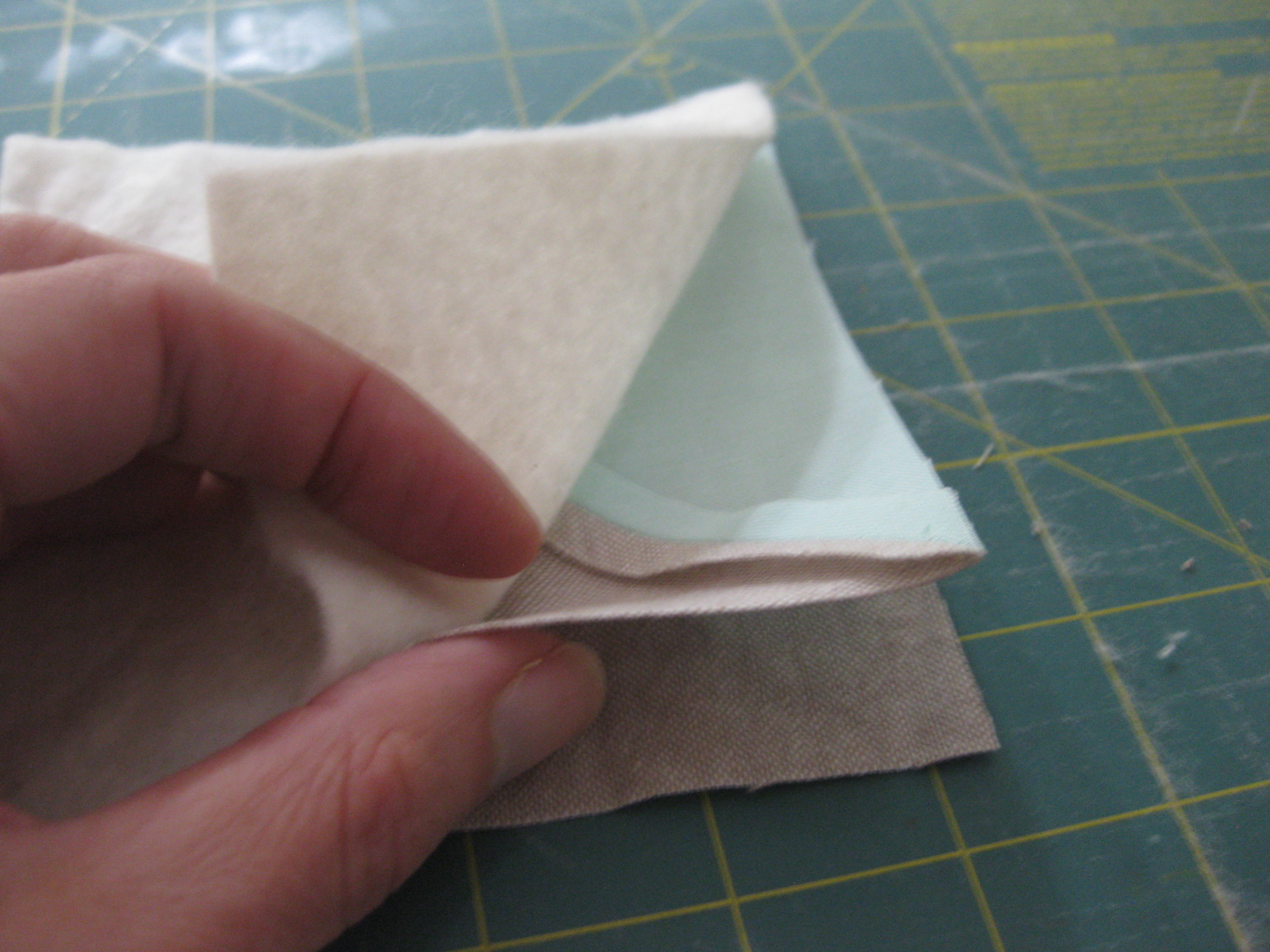 5. Trim the corners and then turn your coaster right side out. When you are turning inside out, keep the front and the batting together. Poke out the corners to a neat point with a knitting needle or a chopstick. Turn under the raw edges of the gap so they align with the seamed edges and press. Pin the gap closed and then edge stitch around each triangle (back stitch in place at the start and end of each triangle).