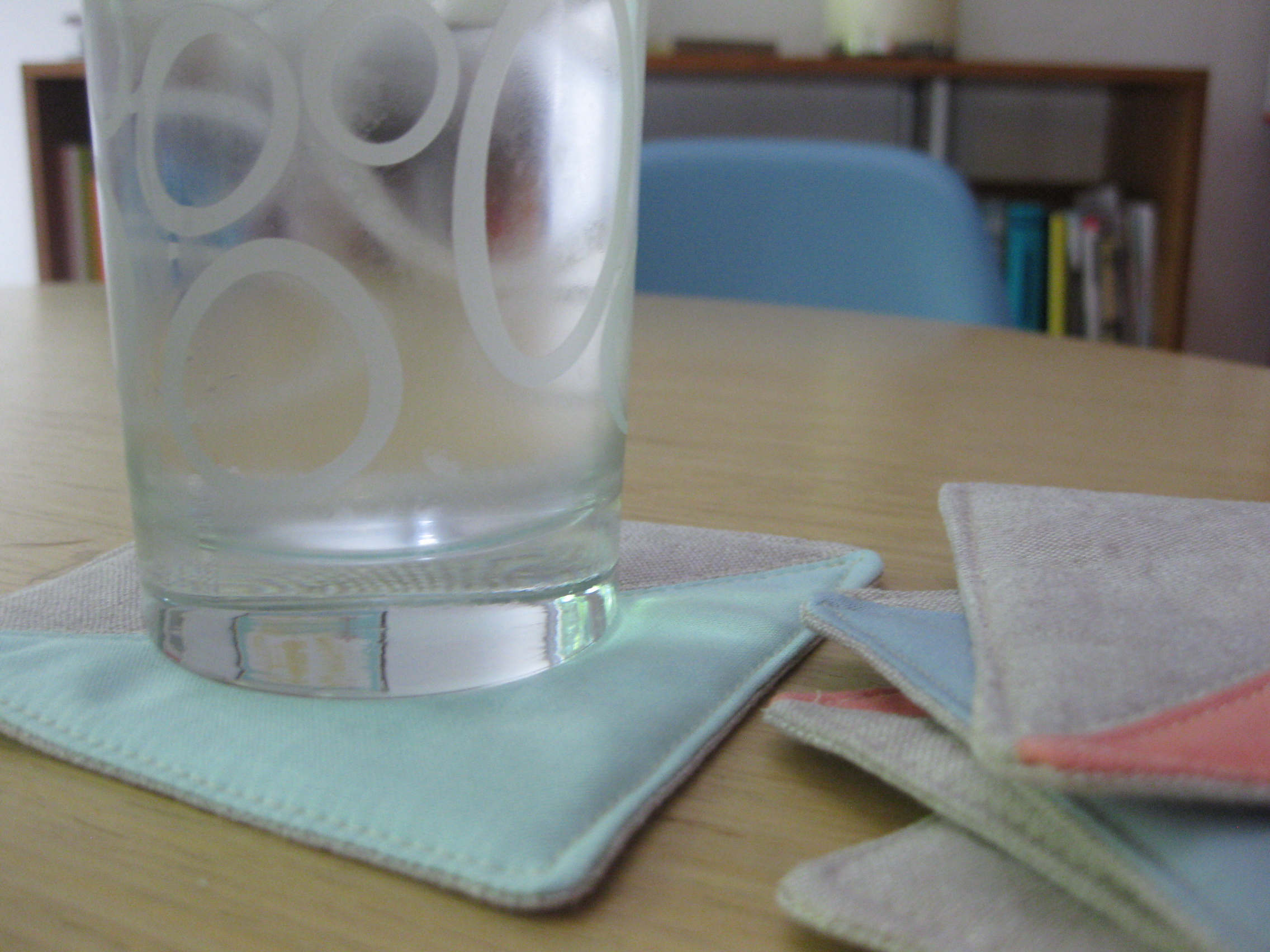 Just in time for ice cold drinks, these nifty linen and cotton coasters are ready to get to work catching drips (and adding some springtime color to your table.) Better yet, a set of these would make a lovely Mother’s Day gift. You can make a set of six in about an hour and your materials will cost $10 at most (or nothing if you are a hoarder of scraps like me).