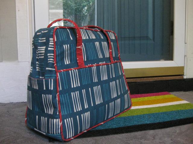 I have to say … I can’t believe I made luggage. Not that I have tested this bag’s durability through airport security, but it looks impressive. The pattern is by Amy Butler, and I can recommend it if you have patience and strong hands. There is a fair amount of wrangling involved in making this bag, but the instructions are very clear and are easy to follow–in theory. The fabric is Jennifer Jones’s Outside Oslo, which we both seem to love.