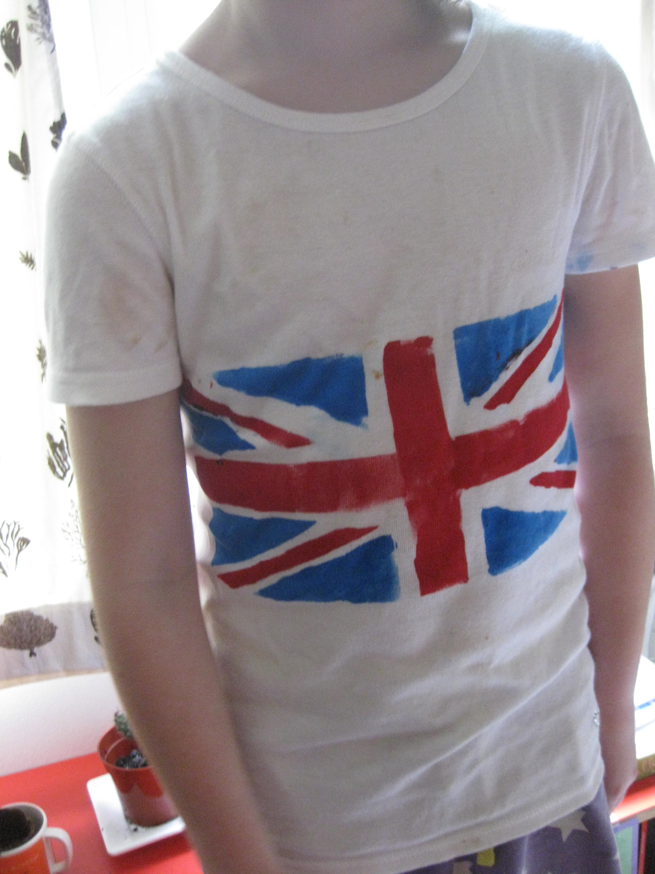 A few hints in case you want to try this activity. Put a layer of paper, wax or freezer, between the layers of fabric. Some paint soaked through to the back of my daughter’s t-shirt. (She was more than happy to apply paint liberally…) Get started early, because the paint takes some time to dry. Iron on the reverse side of the fabric for 30 seconds. I’m not sure why the reverse side, but the Union Jack has stayed bright and cheerful through several washes.