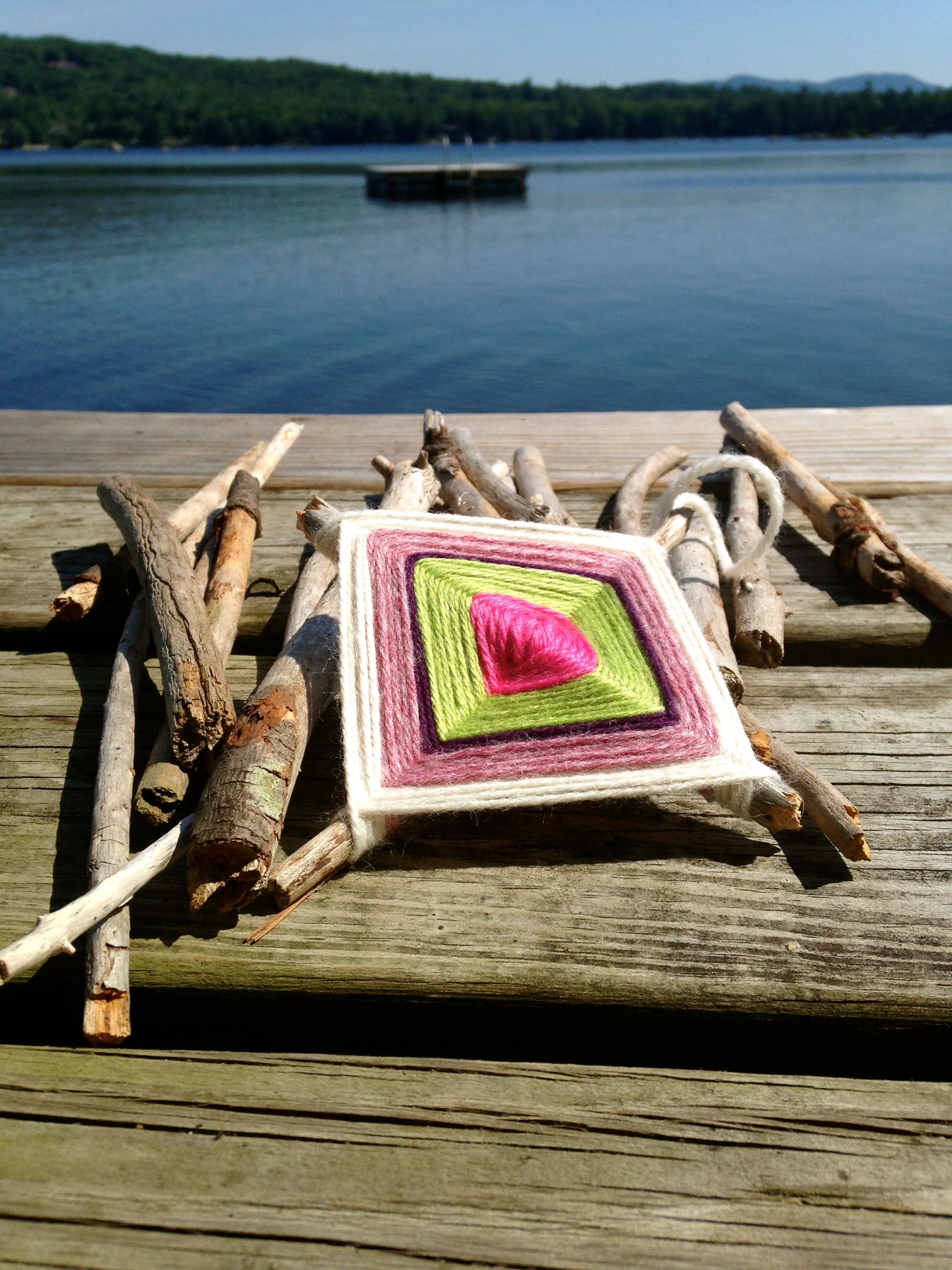 After a morning of cannonballs and pencil dives off the dock, followed by an epic Wiffle ball game, we were finally ready for some quiet time at the lake. The cousins, ages 7 through 9, helped me try out this camp favorite, the God’s eye. We had about 6 skeins of yarn and a bunch of sticks from the pine forest. We followed the directions from wikihow.com and Aunt Annie (the illustrations at Aunt Annie were helpful). Our process was only a little different from the directions: we didn’t use glue, so to bind the sticks together, we wound and wound the yarn around them (making for messier centers) and to secure at the end, we just tied off the yarn.