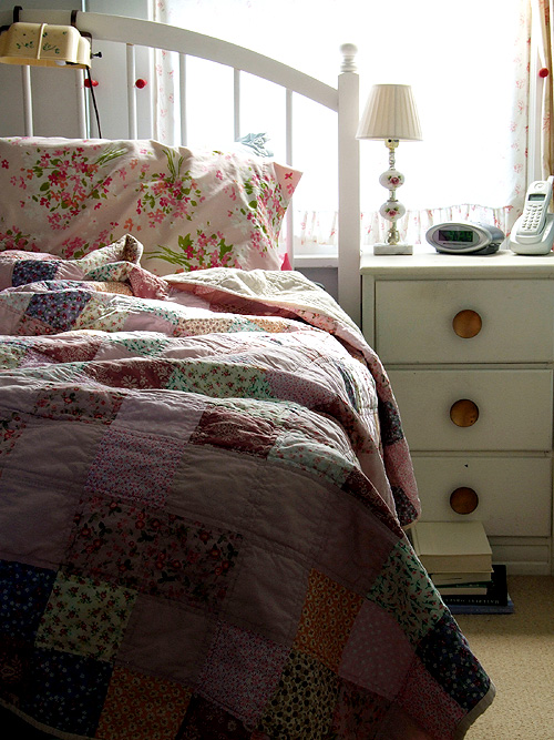 For newbies like me, chain-piecing means sewing two patches right side together and then just lifting the presser foot and feeding in the next pair to make a continuous chain. You cut the pairs apart later. Two other rookie things I’ve learned: there’s no backstitching in quilting, and quilters really dig a 1/4″ seam allowance (so if a pattern doesn’t give an allowance, bank on that one).