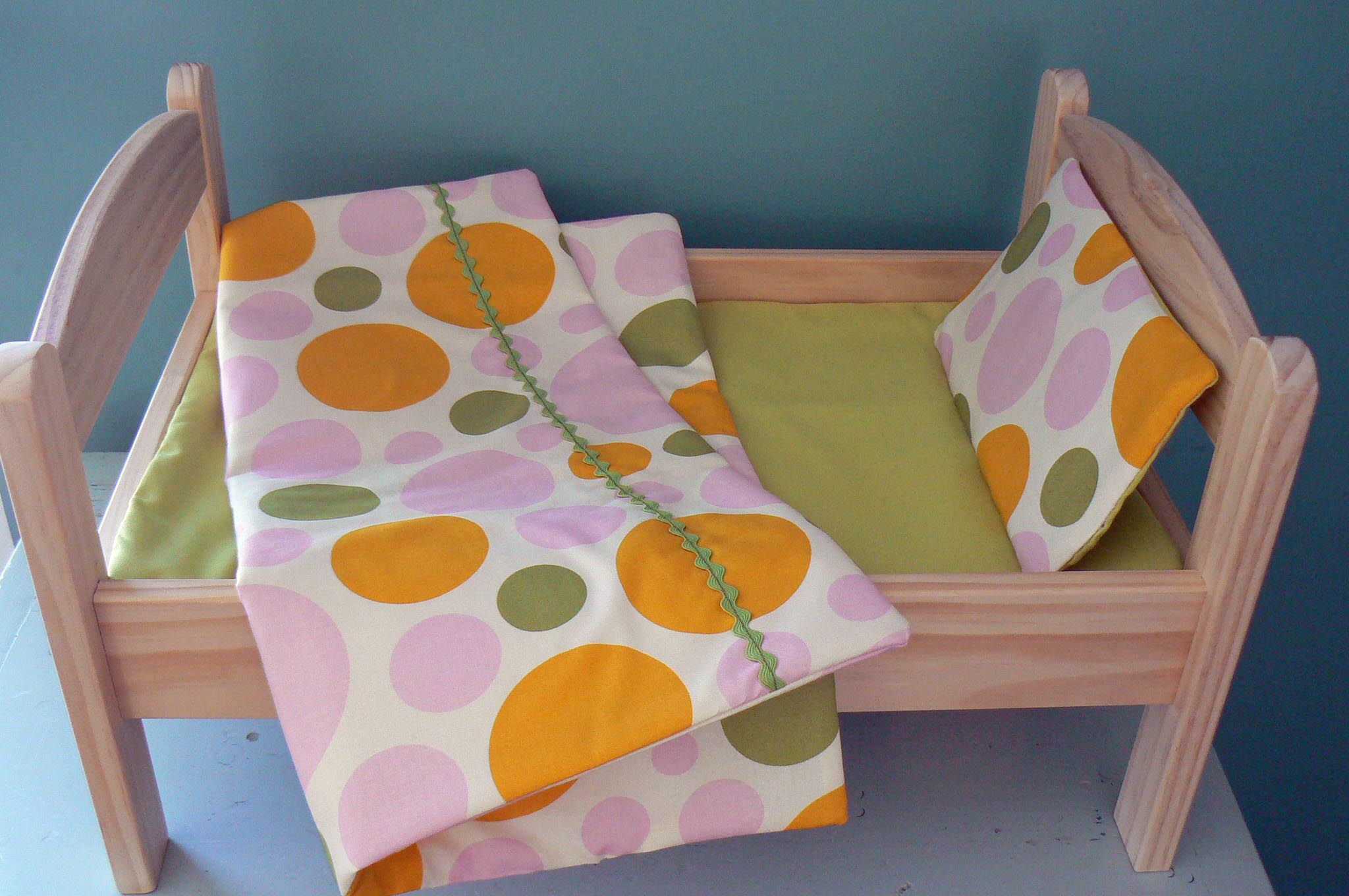 My other small adventure: sewing covers for the ugly blue mattress and pillow that came with the IKEA doll bed I bought for my neice and nephew. (Why does IKEA favor retina-searing shades of blue?) I also sewed a doll blanket to go on top. (For Boston locals: I bought the big polka-dot print from Fabric Corner, a sewing shop on the corner of Mass Ave. & Mill Street in Arlington, which has a lovely fabric selection & kind, friendly staff.) Following Brigit’s doll quilt post, I just sewed regular seams and turned inside out (although I added a layer of quilt batting and didn’t do the quilter’s knots).