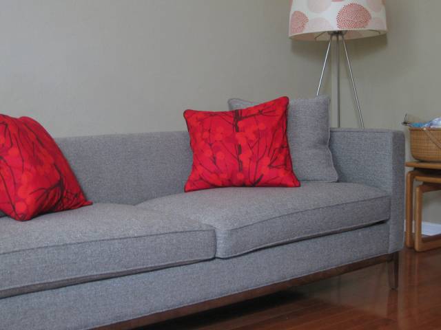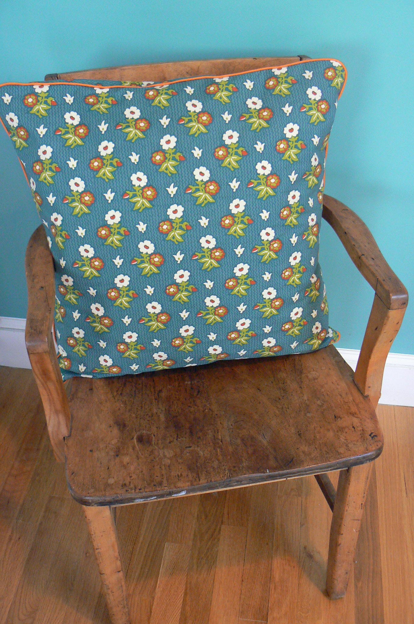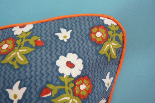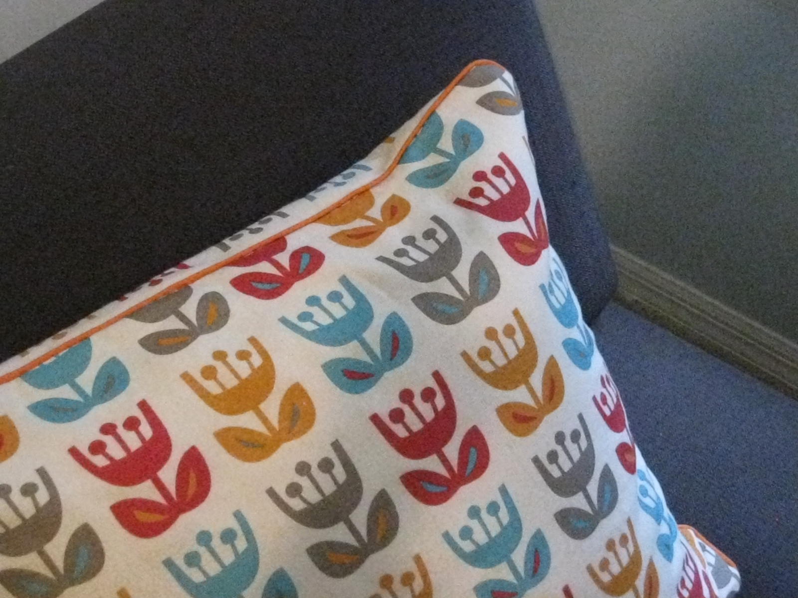 Here is my Jessica Jones, Outside Oslo pillow, with orange piping. I’ve been in a sewing frenzy the last few weeks–all thanks to my magical zipper foot. I was so inspired by Margaret’s beautiful piping that I finally gave the foot a whirl. I also made these cushions using Marimeko fabric, and brown piping.