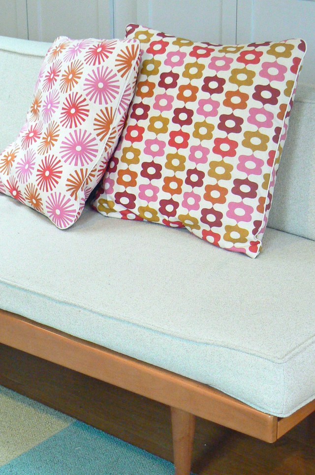 For the VW bug pillow, I used a pattern for an envelope enclosure. Beige linen in the front, groovy cotton print in the back, and orange piping.